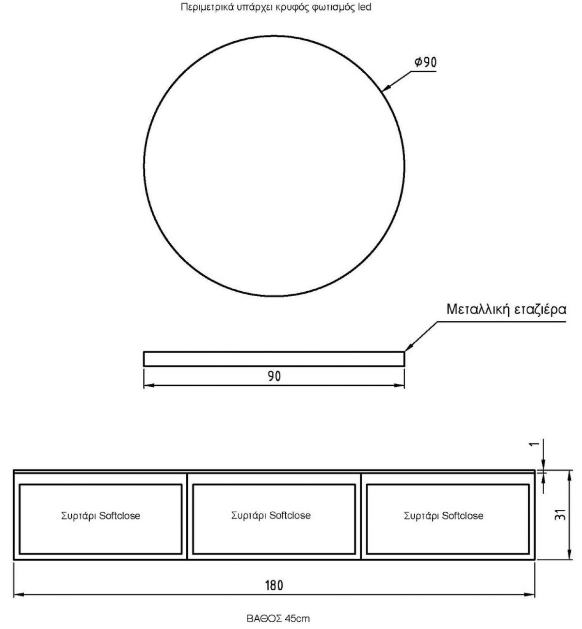 Base 180x31x45Mirror with hidden LED light Φ90Compact Countertop 5156