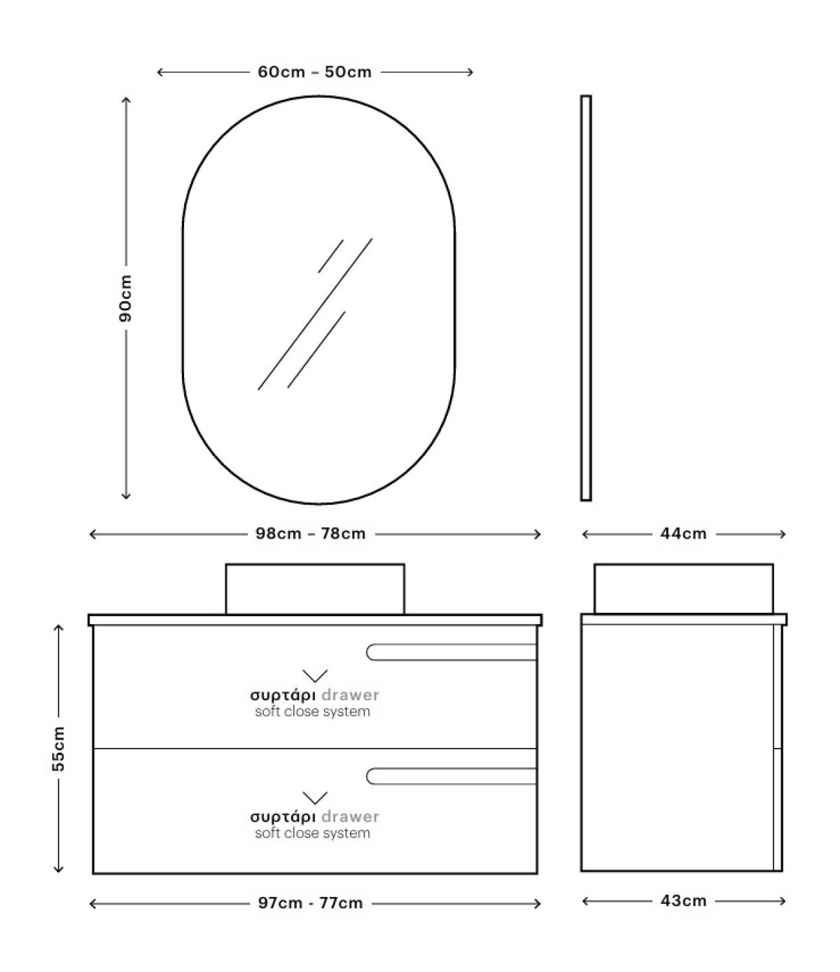 Base 78/98x43x55cmWashbasin GIO Φ42cm ΛΕΥΚΟΣWorktop SOLID WHITE 12mmMirror OVAL LED 60x90cm