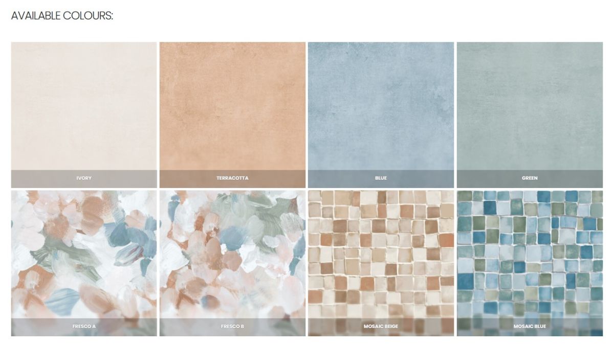 Color:Avorio, Cotto, Blu, VerdeFresco A, Fresco B, Mosaic Beige, Mosaic Blue