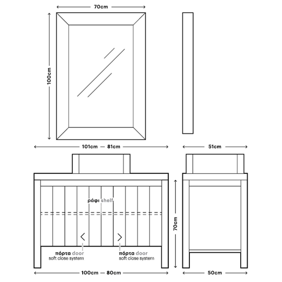 Base 80/100x50x70cmWorktop SOLID PINE WOOD 40mmWashbasin AZULEY 65x45cmMirror ART 100x70cm